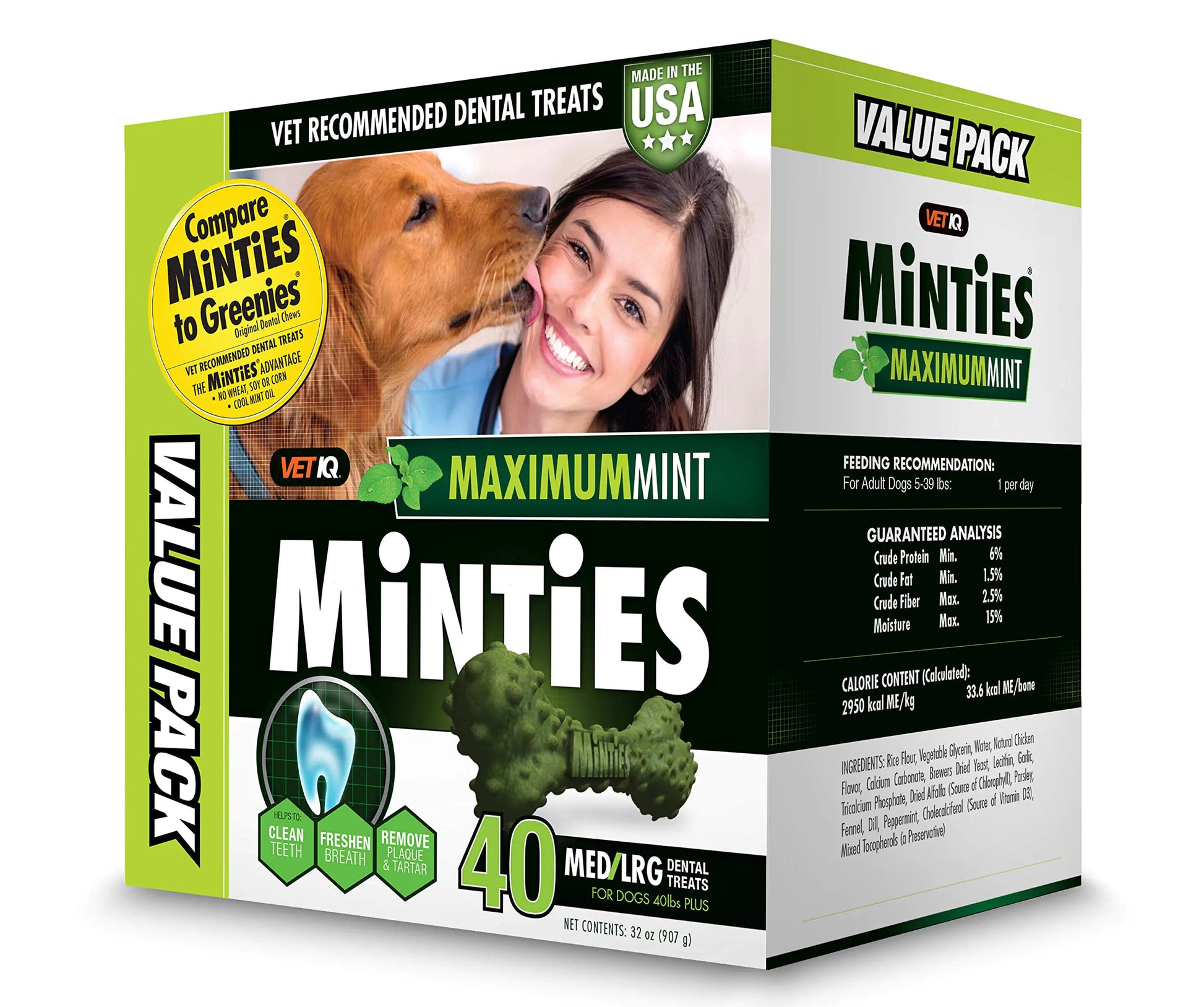 Minties dog dental treats not only promote fresh breath they help keep your dog’s teeth healthy and clean. As the ultimate a dog teeth cleaning treat and dog breath freshener Minties provides total oral health for your dog helping remove plaque and tartar by the mechanical action of chewing the bone. Minties an affordable alternative to Greenies for dogs; made from ingredients that your dog will love. No wheat soy corn artificial flavors or Animal by-products. No added sugars or salts. Gluten free.